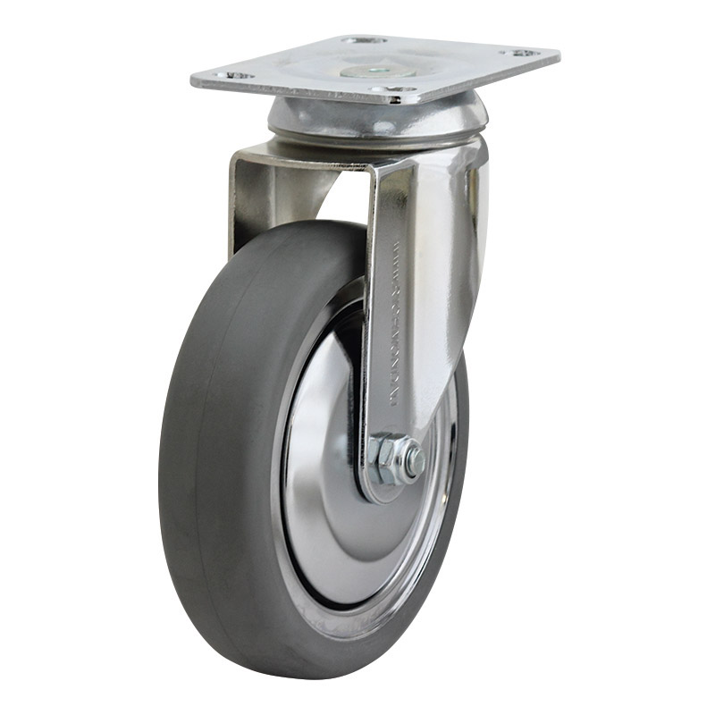 The S5574 manufactured by Richmond Rolling Solutions is a swivel frame castor and features a institutional rubber wheel. This swivel castor is in our chrome durolite plate range and can hold loads up to 100kg. The S5574 uses ball bearings for wheel rotation and is mounted with the baseplate. The swivel frame of this castor allows the castor to swivel 360°. The overall institutional rubber wheel diameter is 125mm, the wheel width is 32mm and can be ordered separately (iR5004).
