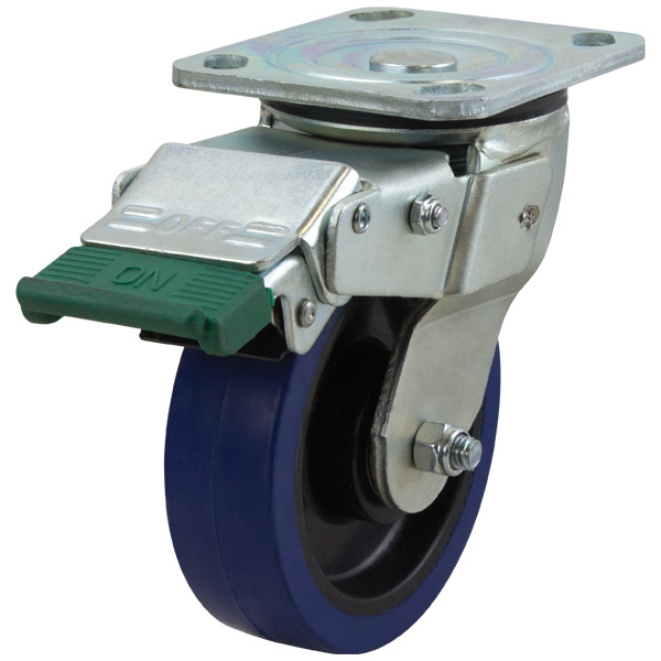 Our 125mm Rebound Rubber Wheel Richmond Castor – S5544D is in our comprehensive series of industrial castors. The wheel runs on Ball Bearings and the wheels diameter is 125mm (5″). More information on the Rebound Rubber wheel can be found here. The max load of this heavy industrial castor is 200kg and features a directional lock. Swivel frame castors such as this one allow full swivel rotation of the wheel. Rebound rubber wheels are non marking however they have a higher rolling resistance than some other wheel types.