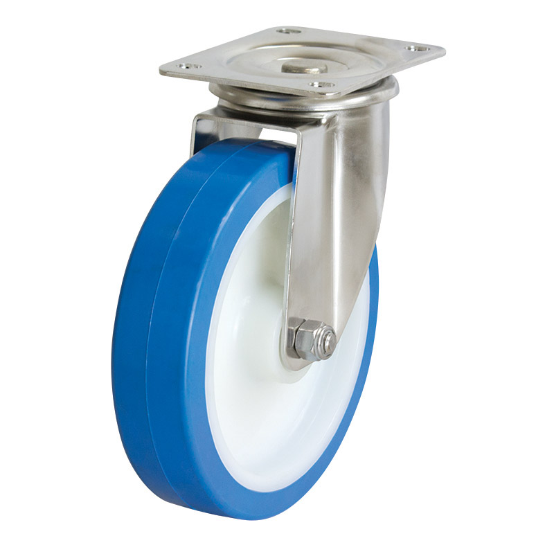 The S8144 from Richmond Rolling Solutions is a swivel frame castor and features a rebound polyurethane wheel. This swivel castor is one of our stainless steel excel plate range and has a top load capacity of 300kg. The S8144 wheel is fitted with stainless steel roller bearings and is mounted with the baseplate. The swivel frame of this castor allows full swivel rotation to enable steering. The overall rebound polyurethane wheel diameter is 200mm, the wheel width is 50mm and you can order separately (Part Number: RP8072). This model can also be ordered with a brake (part number S8144B).