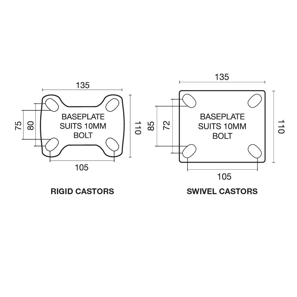 The R8051 manufactured by Richmond Rolling Solutions is a rigid frame castor and has a rubber tyred nylon wheel. This rigid castor is one of our 300 series plate range and can hold loads up to 200kg. The R8051 is assembled with ball bearings on the castors axle and is mounted with the baseplate. The diameter of the rubber tyred nylon wheel is 200mm, the wheel width is 35mm and can be ordered separately (RN8876).