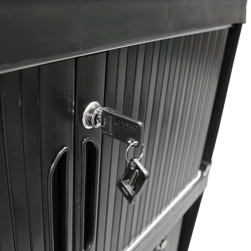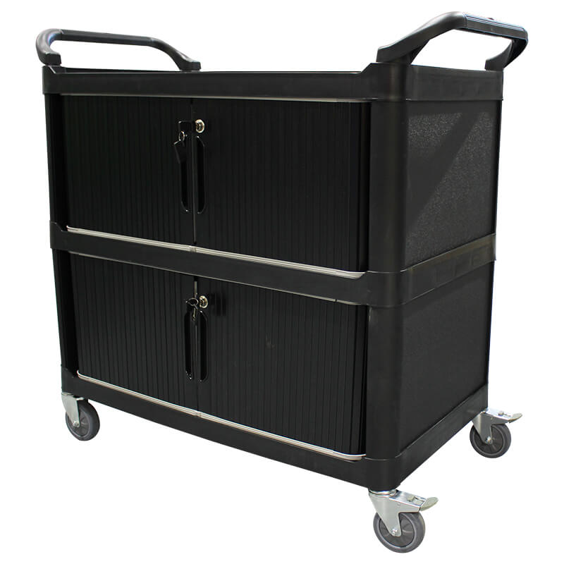 The STR327 Service Trolley comes with 2 x Swivel and 2x Brake 100mm castors and includes lockable cabinet doors for securing your items. For a similar trolley without the doors, see STR324 or STR325
