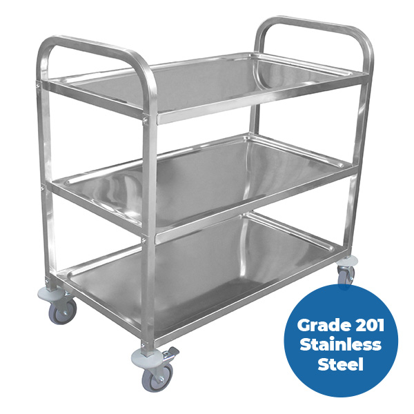 A range of sizes and configurations are available in grade 201 and 304 stainless steel. Richmond can source 316 and 430 Stainless steel service trolleys on request.