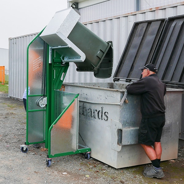 This Ezi-MT manual bin tipper does the heavy lifting for you. The reliable winch design easily lifts your bin and safely empties its contents into your skip or hopper – eliminating back injury from lifting bins and emptying them by hand.