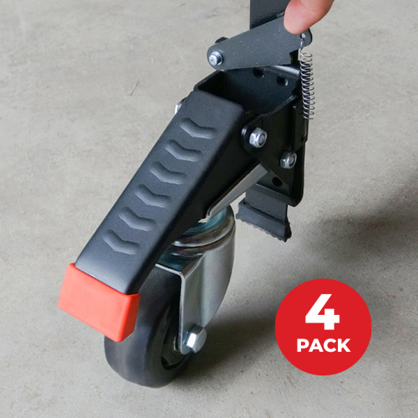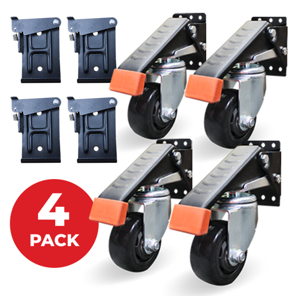 Each 75mm (3”) polyurethane castor can support up to 100kg (400kgs combined set capacity). Each swivel castor can pivot 360° once raised. All required mounting hardware is included.